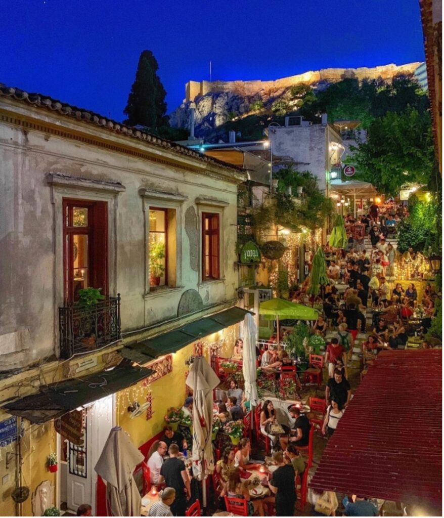 Plaka has a village feel, with its narrow cobblestone streets lined with tiny shops selling souvenirs, sandals, jewelry, cloths, ceramics and much more. You will also find many sidewalk cafes, some with beautiful terraces, and family run tavernas that stay open until late for those nighttime cravings.